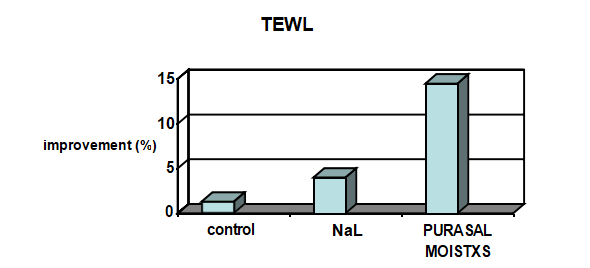 在本試驗中顯示PURASAL® MOISTXS 也顯著降低了經表皮的水分流失